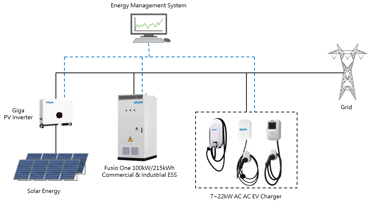 Ideal for medium-sized commercial spaces, with a storage system and 60kW DC charger for increased efficiency.