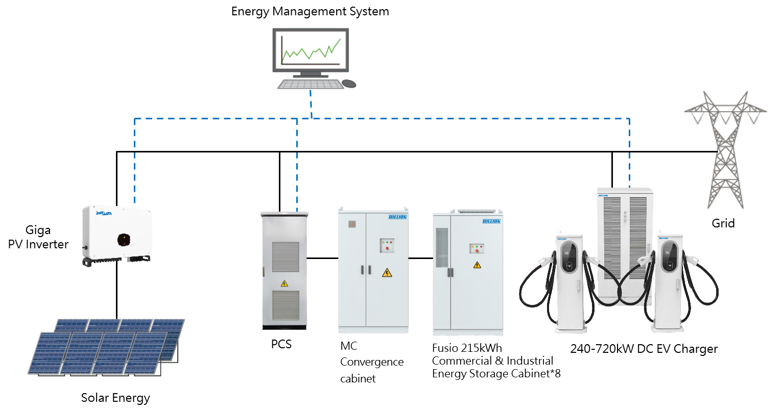 Provides a 200kW/1720kWh storage system with 240–720kW DC chargers, perfect for microgrids or high-traffic transit hubs.