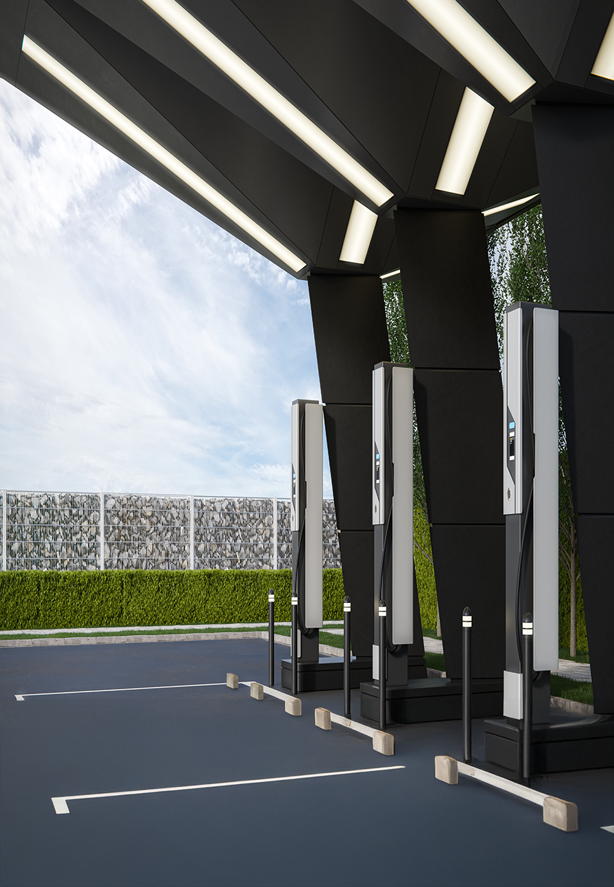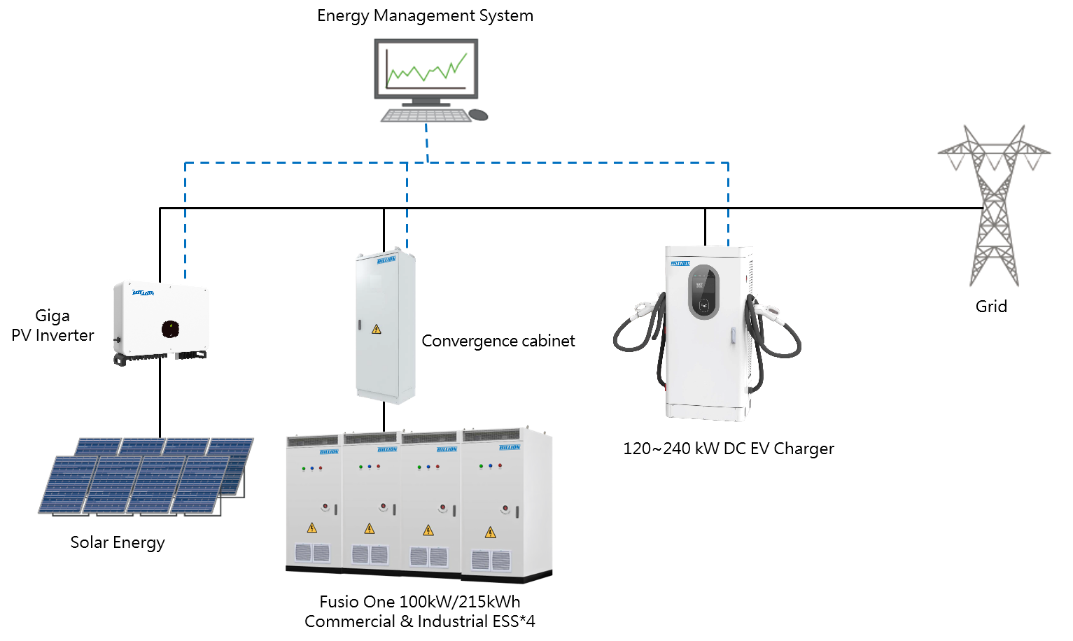 Designed for large commercial facilities, featuring a storage system with 120–240kW DC chargers for high-frequency usage.